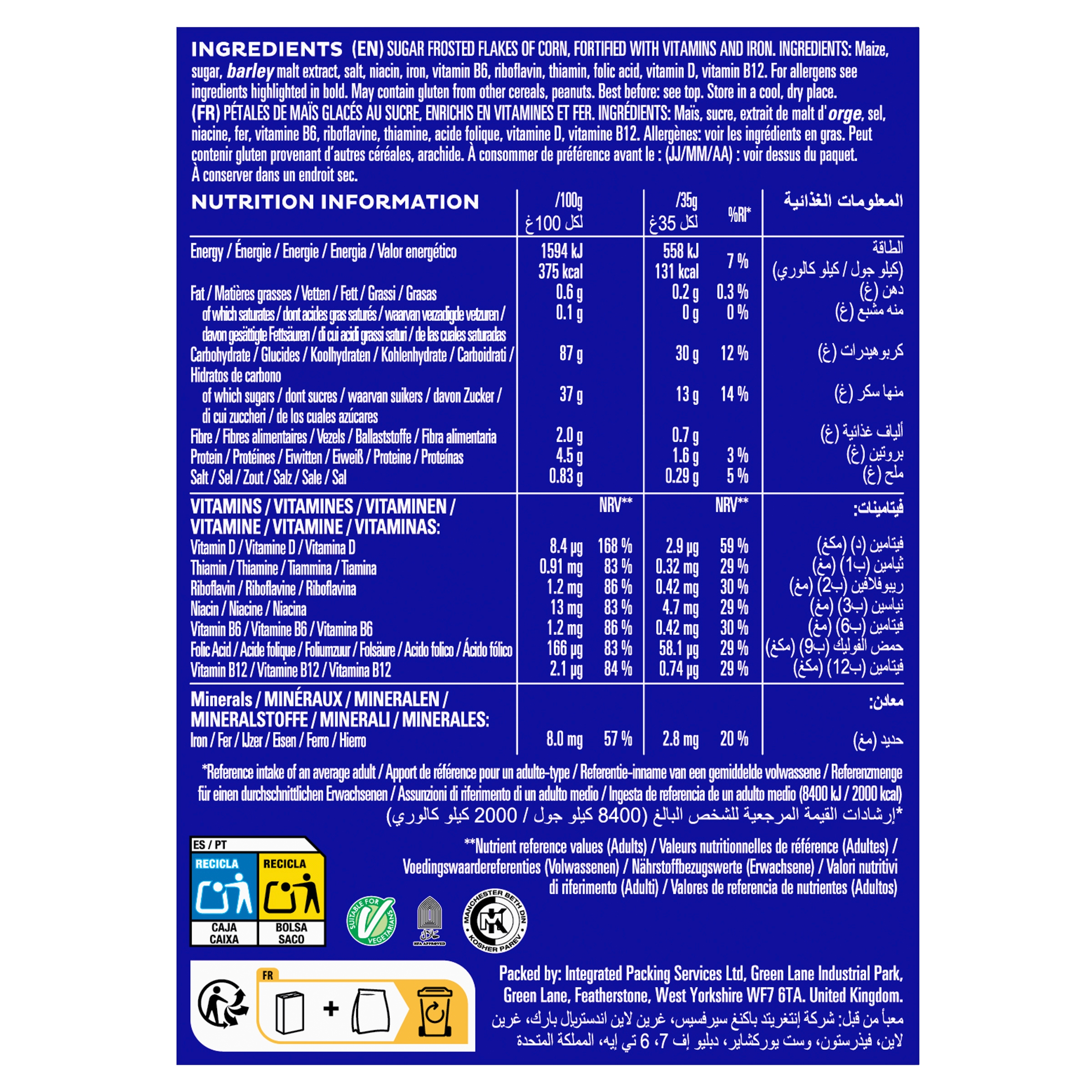 Enjoy a breakfast table classic Kellogg’s Frosties. Dusted with a frosted coating, Kellogg's Frosties breakfast cereal tastes grrrreat. Each bowl of Kellogg’s Frosties breakfast cereal contains added goodness▪ and has 50% of your daily vitamin D needs and no artificial colours or flavours. ▪Source of vitamin D, B1, B2, B3, B6, B9 & B12 and iron. Vitamin D contributes to the maintenance of normal bones. Enjoy as part of a varied &