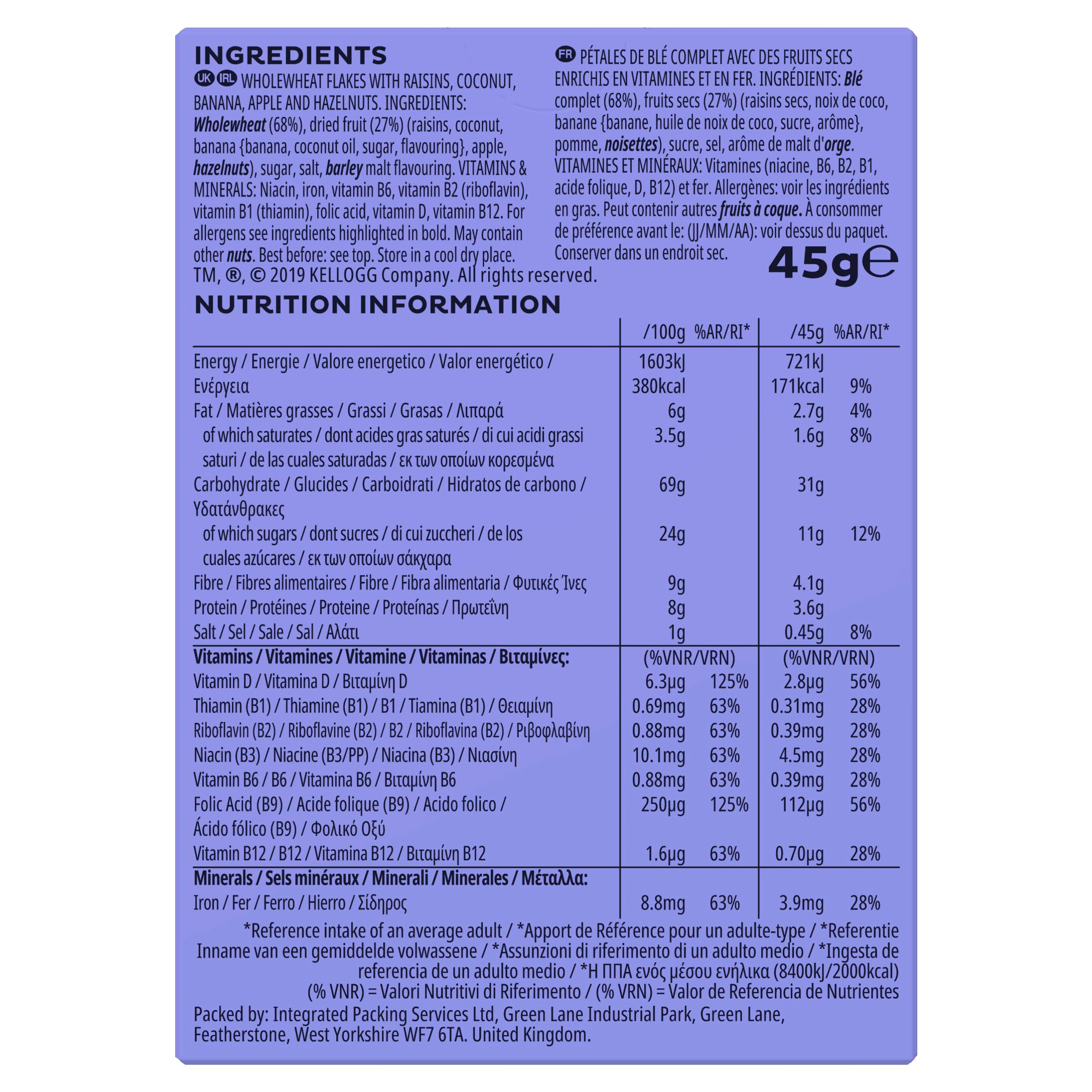 Wholewheat (70%), dried fruit (25%) (raisins, sultanas, coconut, banana {banana, coconut oil, sugar}, apple), sugar,barley malt extract, salt, niacin, iron, vitamin B6, riboflavin, thiamin, folic acid, vitamin D, vitamin B12.