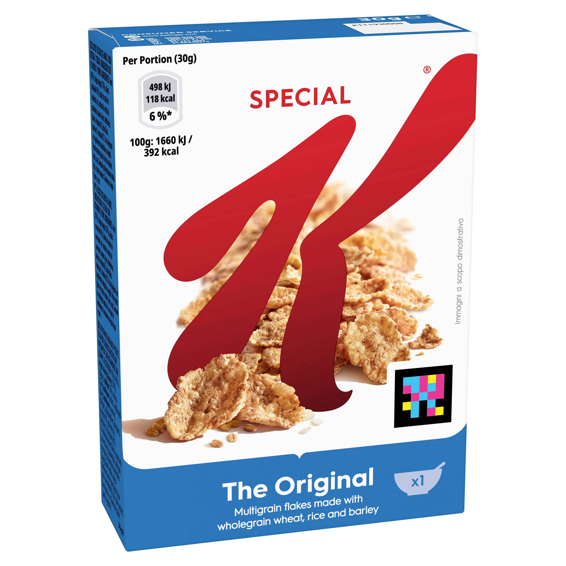 Start your day with Kellogg’s Special K Original breakfast cereal. Kellogg's Original breakfast cereal is made with three grains: rice, wholewheat and barley. Rolled, flaked & toasted. Kellogg's Special K Original breakfast cereal is made with no artificial colours, flavours, or preservatives. ▪A serving of Special K cereal contains >15% RI of iron and vitamin B6 which contribute to the reduction of tiredness and fatigue, vitamin D which contributes to the normal function of the immune system and vitamin B12 which contributes to normal energy-yielding metabolism. Enjoy the Special K range as a part of a varied, balanced diet and a healthy lifestyle